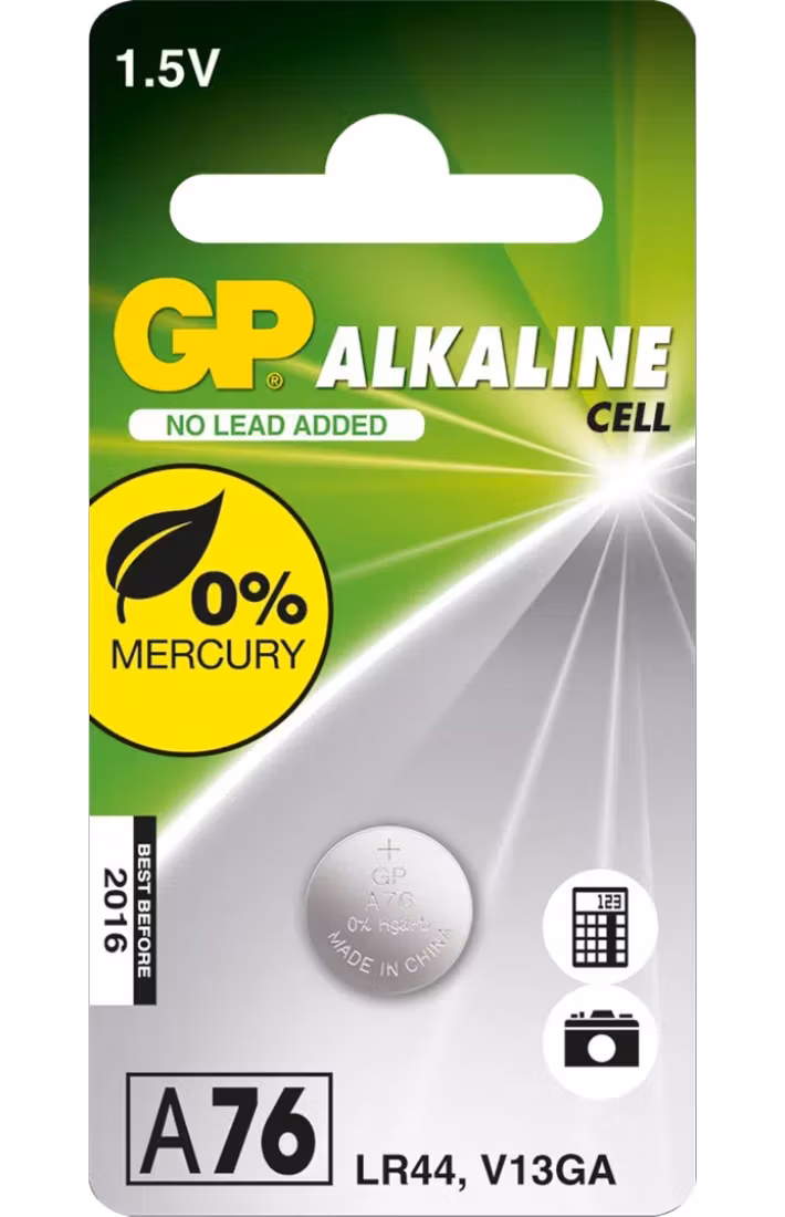 Alkaliska knappcellsbatterier LR44/LR1154. GP:s batterier har fått ”Bäst i test” i konsumentverkets stora test! Bra miljöval – Svanenmärkta och innehåller inget kvicksilver.