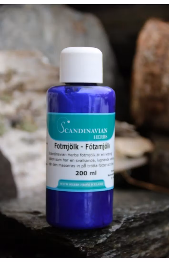Scandinavian Herbs fotmjölk är en krämig lotion som har en svalkande, lugnande verkan när den masseras in på fötter och ben. Lotionen kan användas när som helst på dygnet när fötter och ben känns trötta. Fotmjölken rekommenderas särskilt till de som står och går mycket.I denna mjölk finns örtextrakt av enen som har en linimentliknande verkan, i fotmjölken finns även malva.Fotmjölken masseras mjukt in på fötter och ben, gärna på kvällen. Kombinera med ett fotbad för en riktigt avslappnande effekt.
